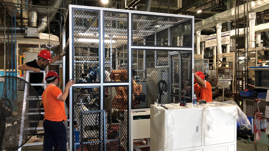 *設(shè)備外圍配置有安全防護(hù)網(wǎng),當(dāng)人進(jìn)入機器人運動范圍內(nèi)必須觸動安裝開關(guān)裝置方可進(jìn),以免機器人造成人身傷害;