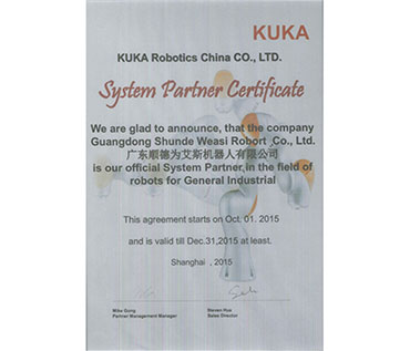 公司獲得kuka系統(tǒng)合作伙伴受權(quán)資質(zhì)