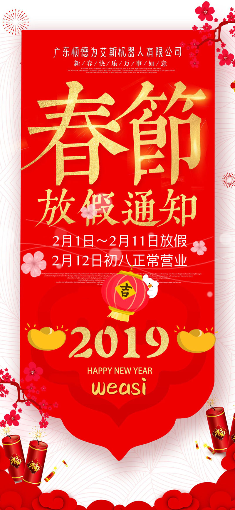 值此新春佳節(jié)即將到來之即,Weasi感謝大家一直以來對公司的支持及關注,在此,提前恭祝大家:豬年大吉,生意興隆,身體健康!