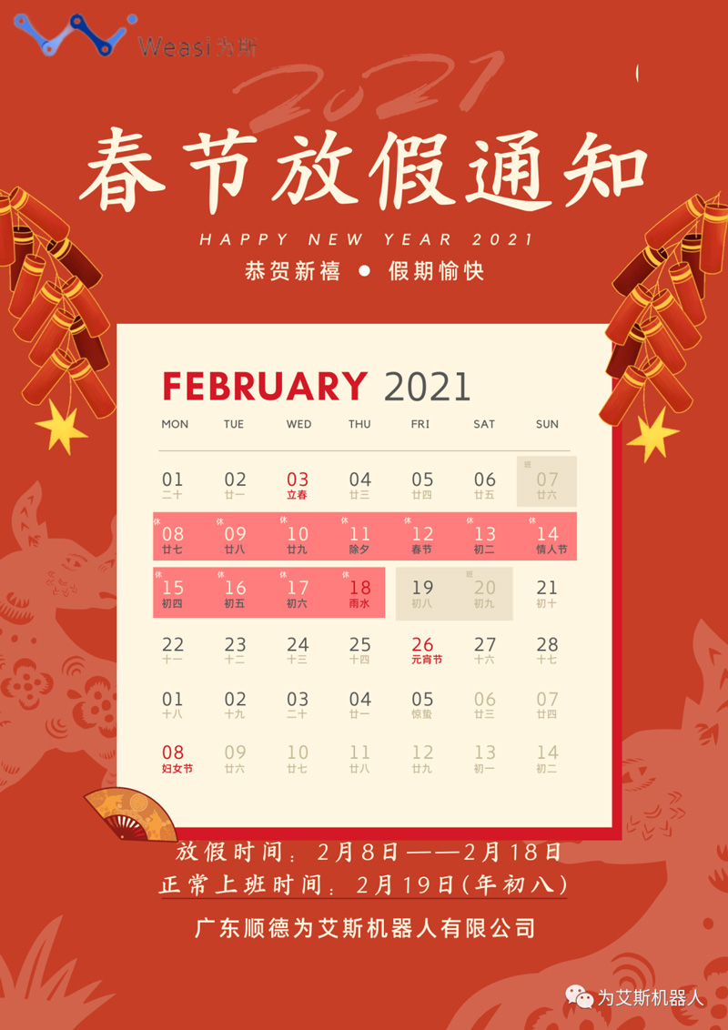 At the beginning of the Spring Festival, everything is renewed. All the employees of Guangdong Shunde Weasi Robot Co., Ltd. are deeply grateful for your long-term support and love for our company! With the upcoming Spring Festival in 2021, all employees of the company wish you a happy New Year, a happy family, good luck and a happy New Year with their best wishes and greetings!